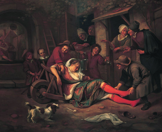 Like all of God’s good gifts, mankind has found ways to turn the gift of wine to gladden the heart into an idol and a curse. The 1663 Steen painting entitled Wine is a Mocker depicts an inebriated young woman in long red stockings and a low-cut dress being dragged into a wheelbarrow by a man while others look on with mocking grins and pointing fingers. A tavern pipe lies beside her on the ground and her shoes have fallen off. The quality of the clothing signifies the young woman’s wealthy status in society, and yet the cut of her dress and the color of her stockings seem to signify that she is a woman of the night.