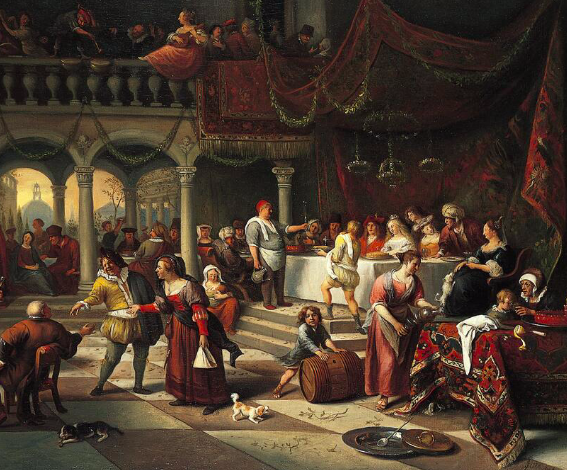 Jan Steen, in his oil painting, perfectly captures that joy and celebration in the faces of the celebrants, communicating that the kingdom of God is joy. The viewer takes in the happiness on all the faces. Even the dogs look happy in the painting. The viewer smiles as he or she enters into the scene, clearly perceiving God’s joy and blessing of wine in Cana. God gives wine to gladden the heart of man. Psalm 114:14