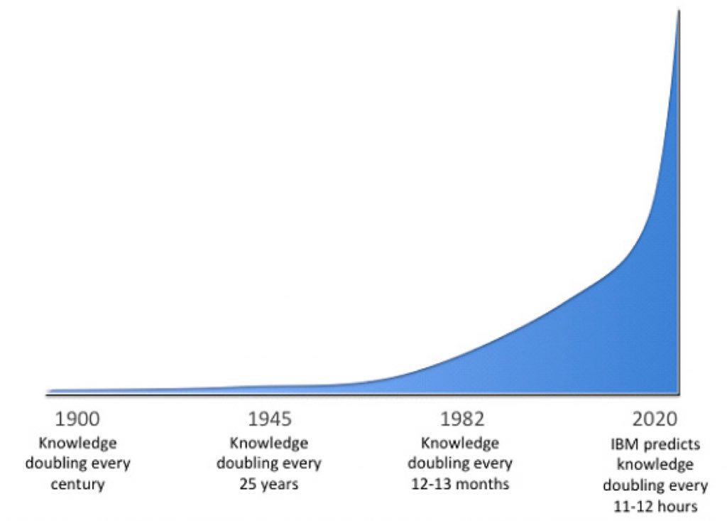 A way to see this concept in how long it takes the amount of knowledge to double is by graphing it. As the graph below shows, in 1900 the rate for information to double was every century; at the end of World War II it was doubling every 25 years: by 1982 the doubling rate was every year approximately, and currently it's on a pace to double every half day!