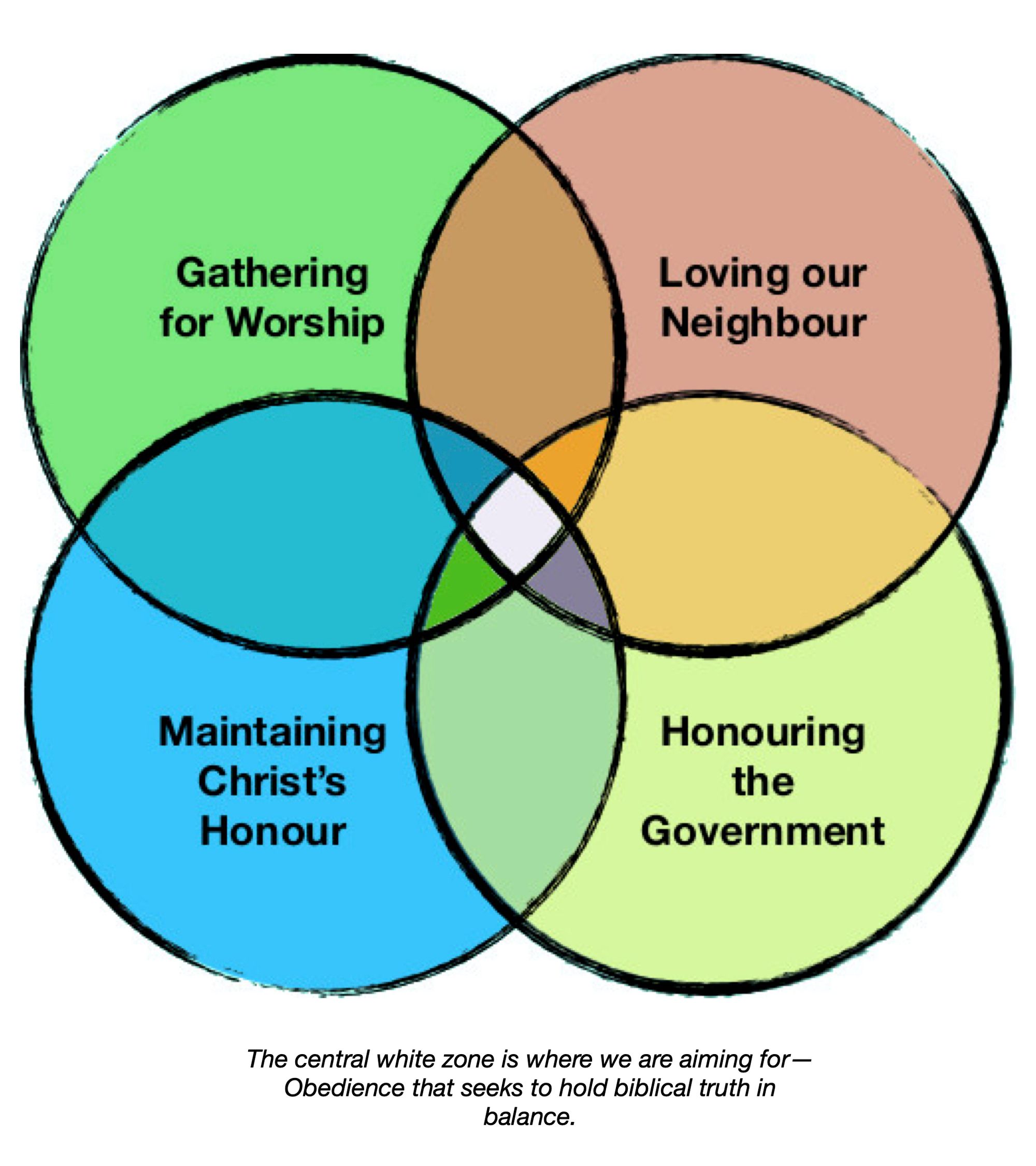 The overlapping zone of these four circles is where we are aiming for. It is where biblical obedience is to be found—obedience that seeks to hold biblical truth in balance.