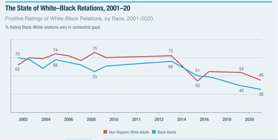 The protests began after the 2014 shooting of Michael Brown in Ferguson, Missouri. Since that time, there has been a collapse in the perceptions of race relations among both black and white Americans. In 2013, the year before Michael Brown’s death, 72 percent of whites and 66 percent of blacks rated black-white relations as either very or somewhat good, according to Gallup polls. But by 2020, those percentages had swooned to 46 percent among whites and 36 percent among blacks.