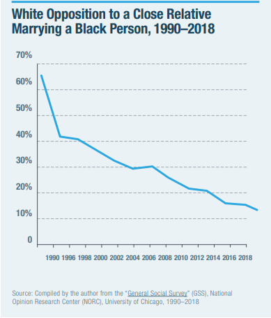· And most telling of all, white opposition to a close relative marrying a black person—which was 65% in 1990—was less than 15% in 2018.