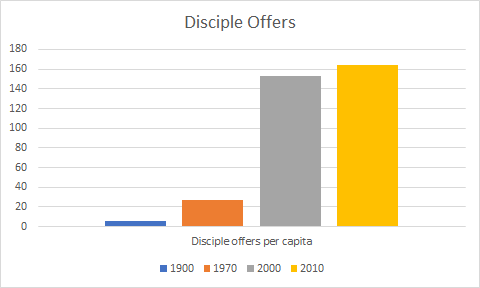 The number of people missionaries reach and the number of times they reach them have grown even more. The average number of times an offer to follow Jesus is given, per person in the world, has shot up more than 25 times since 1900.