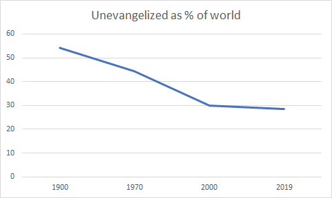 That work has made real progress. The percentage of world defined as unevangelized has fallen from more than 50% at the beginning of the 20th Century, to less than 30% percent today.