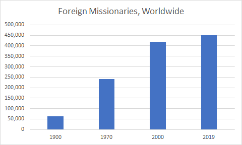 And peace opens opportunities for the gospel. The following charts, based on data from the Atlas of Global Christianity, show that the sheer number of foreign Christian missionaries around the world has grown since 1900—the end of the “Great Century of Missions”—by more than 7 times.