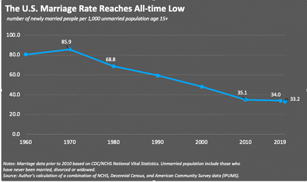 Of course, the story isn’t all positive. One reason for the declining divorce rate is a declining marriage rate. As you can see below, the U.S. marriage rate just hit an all-time low in 2019.