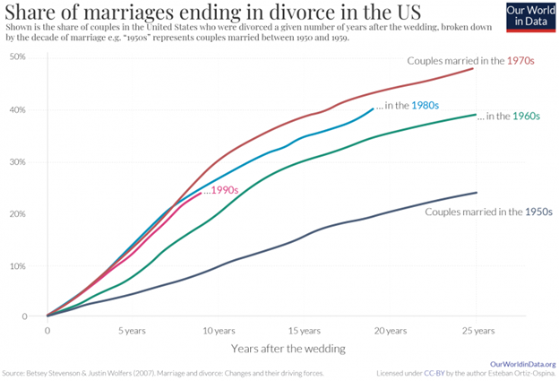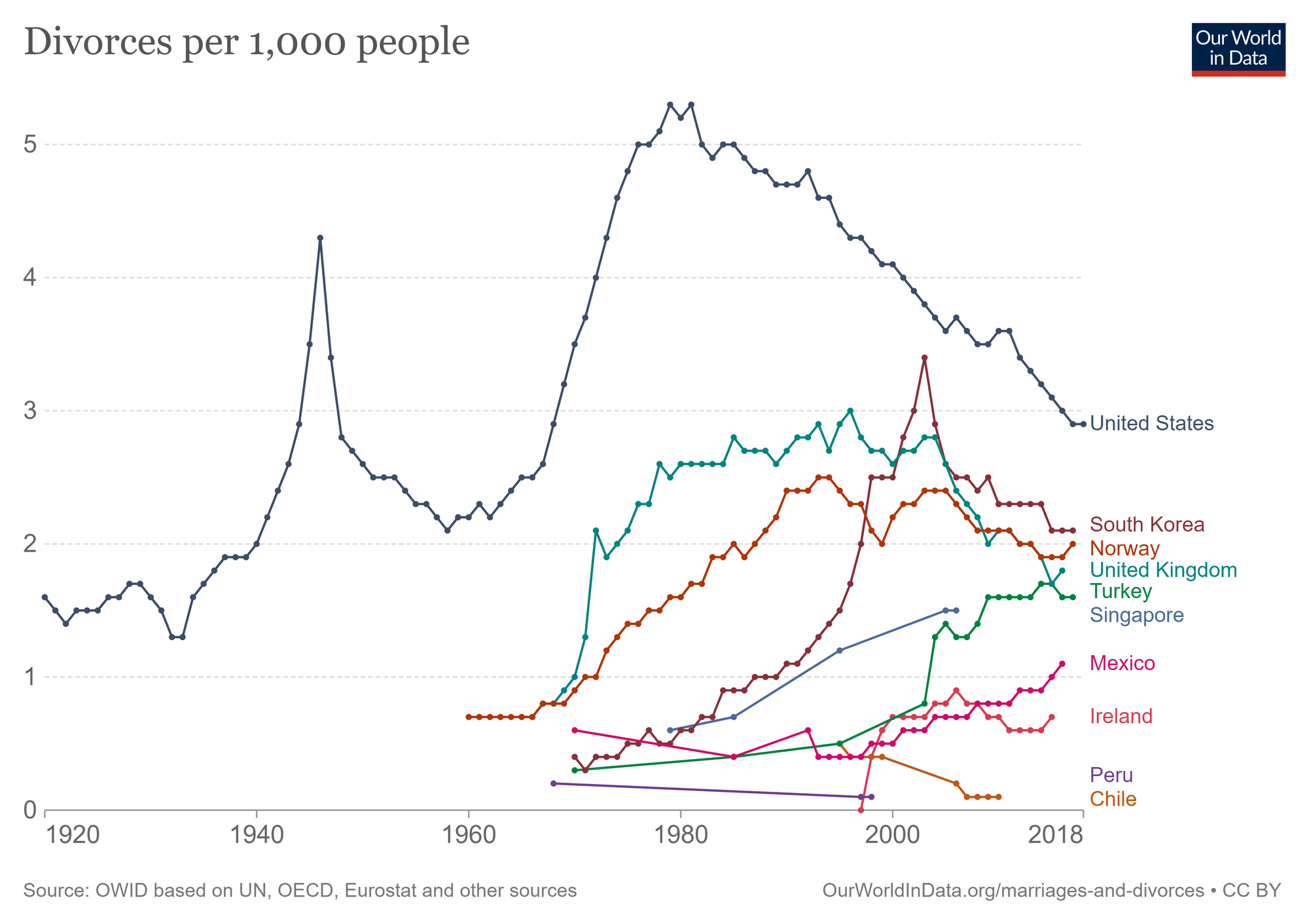 In the U.S. and in most other developed countries around the world, divorces have been falling since the 1990s. They remain higher than, say, the 1960s or earlier. The U.S. rate is roughly double what it was a century ago. But things are moving in a better direction.