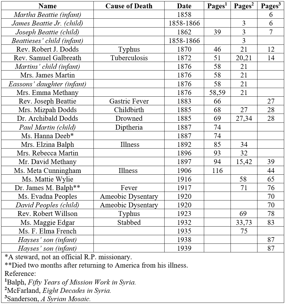 [4] When the pioneer missionary James Beattie’s second child died, his fellow missionary Robert Dodds wrote: “The parents do not sorrow alone for our number is so small, and we are so much like one family, that the loss of the least in our little circle is a sore breach upon us all... We have bought a burying place in the land of our sojourning. May it be to us as Abraham’s was to him, an earnest of the future possession of the whole land.” Sanderson, A Syrian Mosaic, 6. Dodds himself, knowing he would die soon at age 46, whispered, “It is the father’s time.” Sanderson, A Syrian Mosaic, 12. Dr. Methany’s last words were, “I long to be with Jesus.” Sanderson, A Syrian Mosaic, 39. Towards the end of the mission, after the death of Evalyn Hays’ second infant son after 40 days, wrote, “What joy we have when we know we are to receive something, but are we willing to give it back? Our hearts have been searched, and He knows when we pray ‘Thy will be done,’ whether we mean it or not. Let us pray this petition with sincerity.” Sanderson, A Syrian Mosaic, 87. These few quotes, however, are just a sampling.