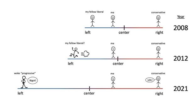 The cartoon was created last year by Colin Wright, an evolutionary biologist and managing editor of Quillette, who described his own reasons for creating it in this op-ed in the Wall Street Journal. But when Musk tweeted it, it set off a fierce debate over the cartoon’s accuracy to explain the increased political polarization we see all around us. Is it that liberals have lurched leftward or is it that conservatives have gone crazy?